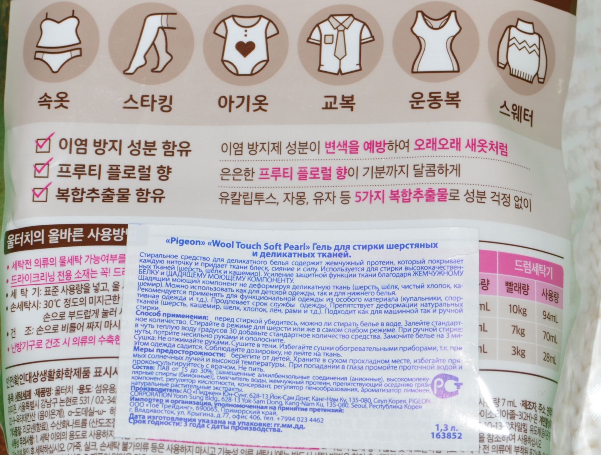 Средство премиум класса для стирки всех типов ткани, в том числе изделий из шерсти, шелка, синтетики, хлопка. PH нейтральный. Предотвращает обесцвечивание, перекрашиванию, деформации ткани. Содержит хитозан, обладающий антибактериальным и увлажняющим действием. Имеет действие кондиционера для белья. Экономичен. При ручной стирке расход в 6 раз меньше, чем в большинстве аналогичных средств. Может быть использован для детской одежды и нижнего женского белья. Безопасный для окружающей среды.